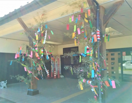 松野尾小児童と地域の方の短冊を飾った七夕笹飾りを展示しています。